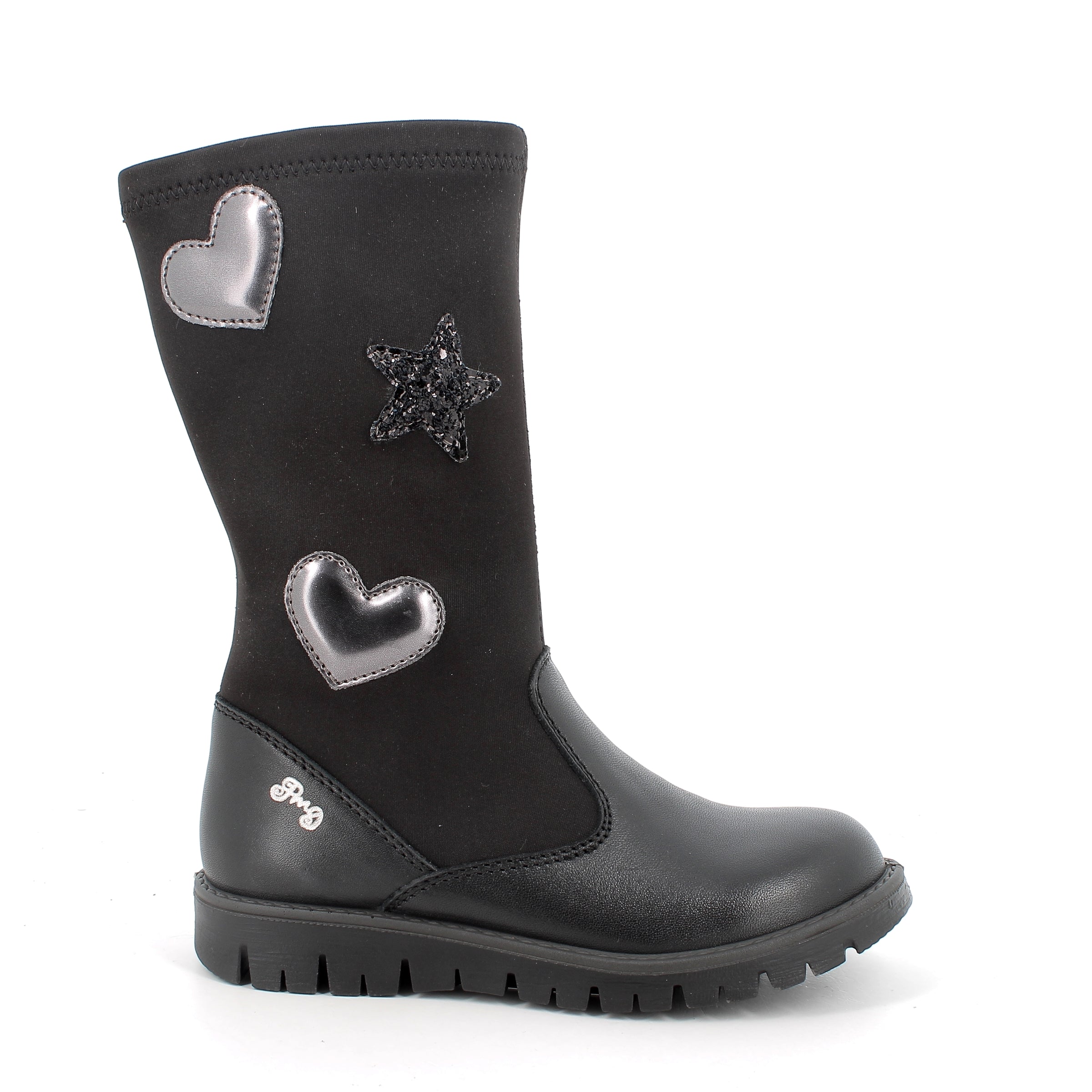 These black leather boots feature a sleek scuba material leg adorned with shiny hearts and glittery stars, adding a playful yet stylish touch. The full-length inside zip ensures easy on and off, while the anti-shock sole provides comfort and protection for active days. Perfect for girls who want both fashion and functionality in one boot.